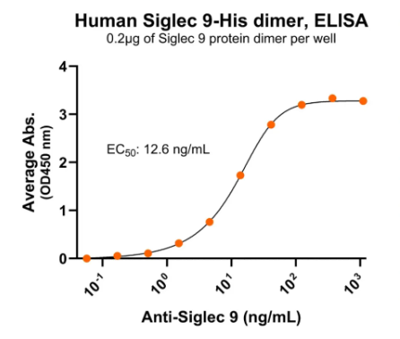 | Description : | Human Sialic acid-binding Ig-like lectin 9 (Siglec 9) is a member of the Siglec family, part of the immunoglobulin superfamily, and a multifunctional immune regulator. It plays an important role in the immune system, especially in regulating inflammation and immune cell activation. Siglec 9 is also known as Cluster of Differentiation 329 (CD329), CDw329, FOAP-9, and OBBP-LIKE. Siglec 9 is a Type I transmembrane protein. It contains an extracellular domain with an N-terminal V-type immunoglobulin domain (Ig domain) and two C2-type Ig domains followed by a transmembrane domain and cytoplasmic signaling domain consisting of the immunoreceptor tyrosine-based inhibitory motif (ITIM). Siglec 9 is expressed on monocytes, neutrophils, and dendritic cells. It binds sialylated glycans on cell surfaces or secreted proteins, modulating cell-cell interactions and immune responses. Siglec 9 can form homodimers on the cell surface that plays a role in ligand binding, signal transduction, and receptor clustering. Some tumors express high levels of sialic acids to engage Siglec 9 and suppress immune attacks — potential immune evasion mechanism. The interaction of sialic acids with Siglecs is associated with suppression of anti-tumor responses has made Siglecs an emerging target for cancer therapeutics. |