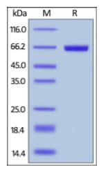 Molecular Mass : | This protein carries a polyhistidine tag at the C-terminus.The protein has a calculated MW of 53.0 kDa. The protein migrates as 60-66 kDa under reducing (R) condition (SDS-PAGE) due to glycosylation. |