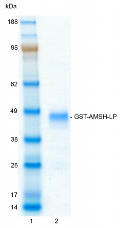 | Description : | There are two main classes of DUB; cysteine proteases and metalloproteases. AMSH-Like Protein (AMSH-LP) is a member of the JAB1/MPN/Mov34 metalloenzyme (JAMM) family and cloning of the human gene was first described by Nagase et al. (2000). AMSH and AMSH-LP share 54% identity and 75% sequence similarity in their JAMM domain. It is known that both proteins act as regulators of free ubiquitin in the cell, bind clathrin, contain a putative nuclear localization signal and an MIT domain. |