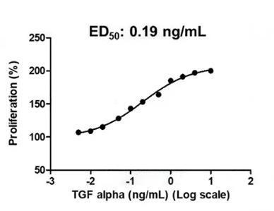 | Bio-activity : | Measure by its ability to induce 3T3 cells proliferation. The ED50 for this effect is < 0.2 ng/mL. The specific activity of recombinant human TGF alpha is > 5 × 10⁶ IU/mg. |