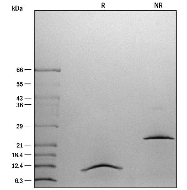 | Molecular Mass : | Predicted Molecular Mass:12.8 kDa (monomer) SDS-PAGE: 12 kDa, reducing conditions, 24 kDa, non-reducing conditions |