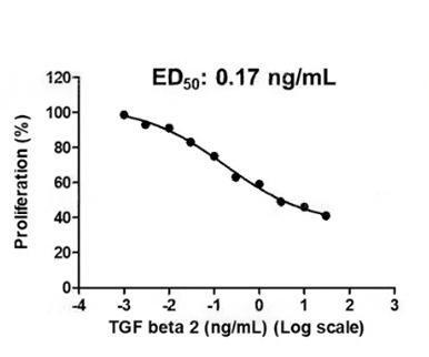 | Bio-activity : | Measure by its ability to inhibit IL-4-induce proliferation in HT-2 cells. The ED50 for this effect is < 0.2 ng/mL. The specific activity of recombinant human TGF beta 2 is > 5 × 10⁶ IU/mg. |