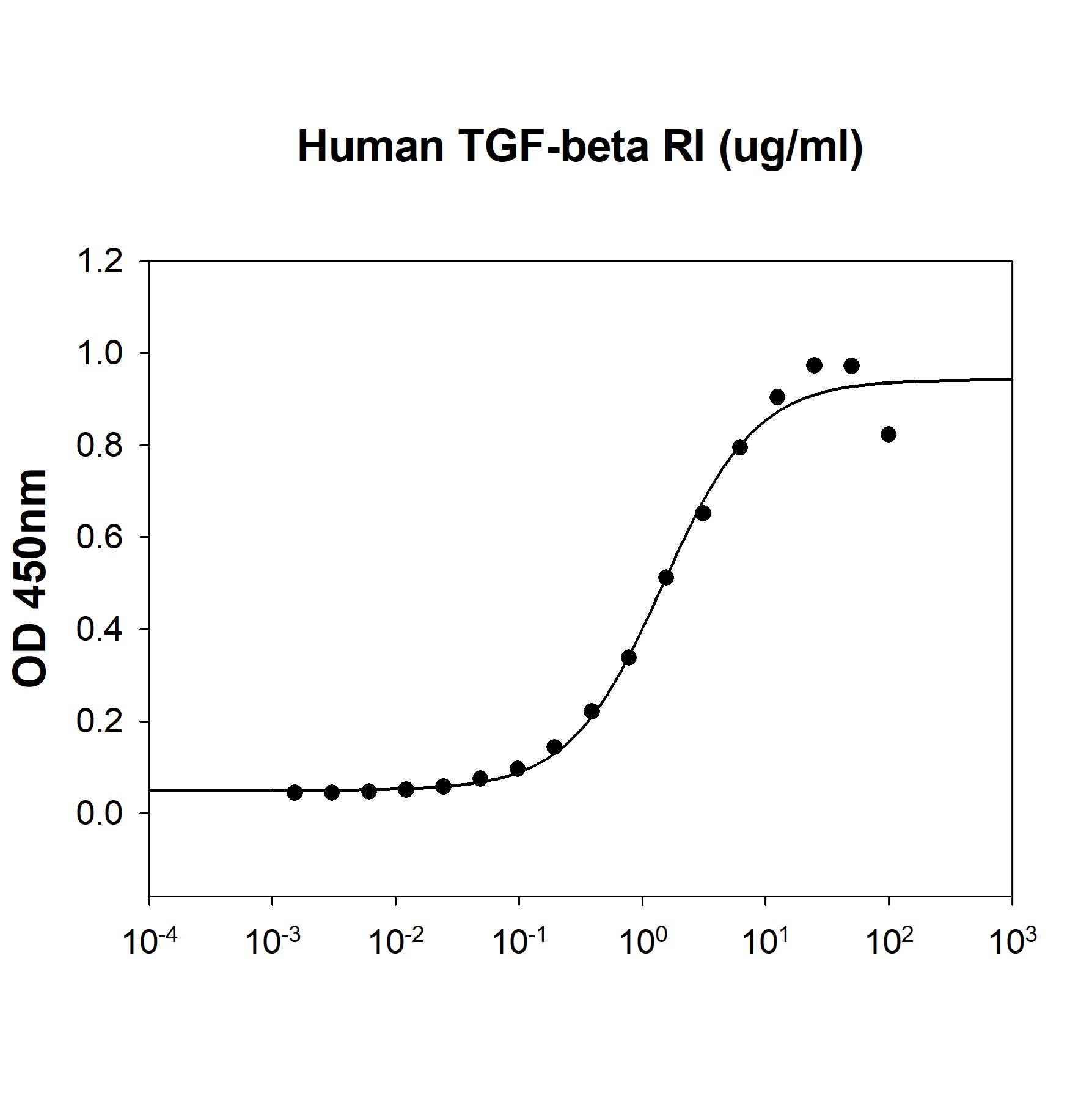 Transmembrane serine/threonine kinase forming with the TGF-beta type II serine/threonine kinase receptor, TGFBR2, the non-promiscuous receptor for the TGF-beta cytokines TGFB1, TGFB2 and TGFB3. Transduces the TGFB1, TGFB2 and TGFB3 signal from the cell surface to the cytoplasm and is thus regulating a plethora of physiological and pathological processes including cell cycle arrest in epithelial and hematopoietic cells, control of mesenchymal cell proliferation and differentiation, wound healing, extracellular matrix production, immunosuppression and carcinogenesis. The formation of the receptor complex composed of 2 TGFBR1 and 2 TGFBR2 molecules symmetrically bound to the cytokine dimer results in the phosphorylation and the activation of TGFBR1 by the constitutively active TGFBR2. Activated TGFBR1 phosphorylates SMAD2 which dissociates from the receptor and interacts with SMAD4. The SMAD2-SMAD4 complex is subsequently translocated to the nucleus where it modulates the transcription of the TGF-beta-regulated genes. This constitutes the canonical SMAD-dependent TGF-beta signaling cascade. Also involved in non-canonical, SMAD-independent TGF-beta signaling pathways. For instance, TGFBR1 induces TRAF6 autoubiquitination which in turn results in MAP3K7 ubiquitination and activation to trigger apoptosis. Also regulates epithelial to mesenchymal transition through a SMAD-independent signaling pathway through PARD6A phosphorylation and activation. |
