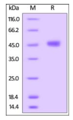 Molecular Mass : | This protein carries a mouse IgG2a Fc tag at the C-terminus.The protein has a calculated MW of 40.1 kDa. The protein migrates as 45-50 kDa under reducing (R) condition (SDS-PAGE) due to glycosylation. |