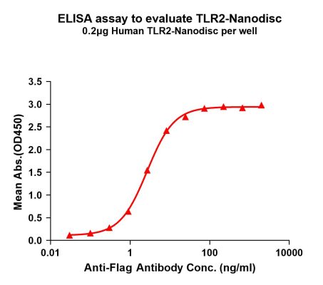 Elisa plates were pre-coated with Flag Tag TLR2-Nanodisc (0.2μg/per well). Serial diluted anti-Flag monoclonal antibody solutions were added, washed, and incubated with secondary antibody before Elisa reading. From above data, the EC50 for anti-Flag monoclonal antibody binding with TLR2-Nanodisc is 2.685ng/ml. |