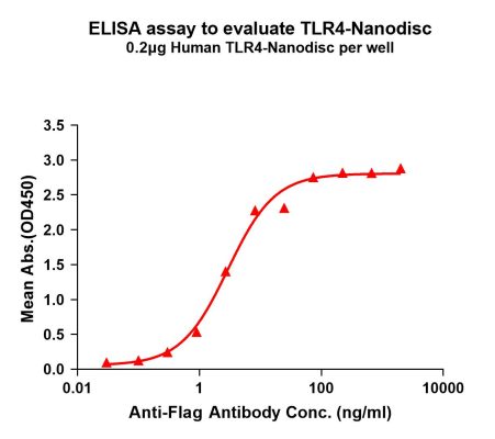 Bio-activity : | Elisa plates were pre-coated with Flag Tag TLR4-Nanodisc (0.2μg/per well). Serial diluted anti-Flag monoclonal antibody solutions were added, washed, and incubated with secondary antibody before Elisa reading. From above data, the EC50 for anti-Flag monoclonal antibody binding with TLR4-Nanodisc is 2.939ng/ml. |