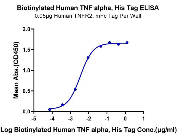 | Bio-activity : | Immobilized Human TNF R2, mFc Tag at 0.5ug/ml (100ul/Well) on the plate. Dose response curve for Biotinylated Human TNF alpha, His Tag with the EC50 of 3.5ng/ml determined by ELISA. See testing image for detail. |