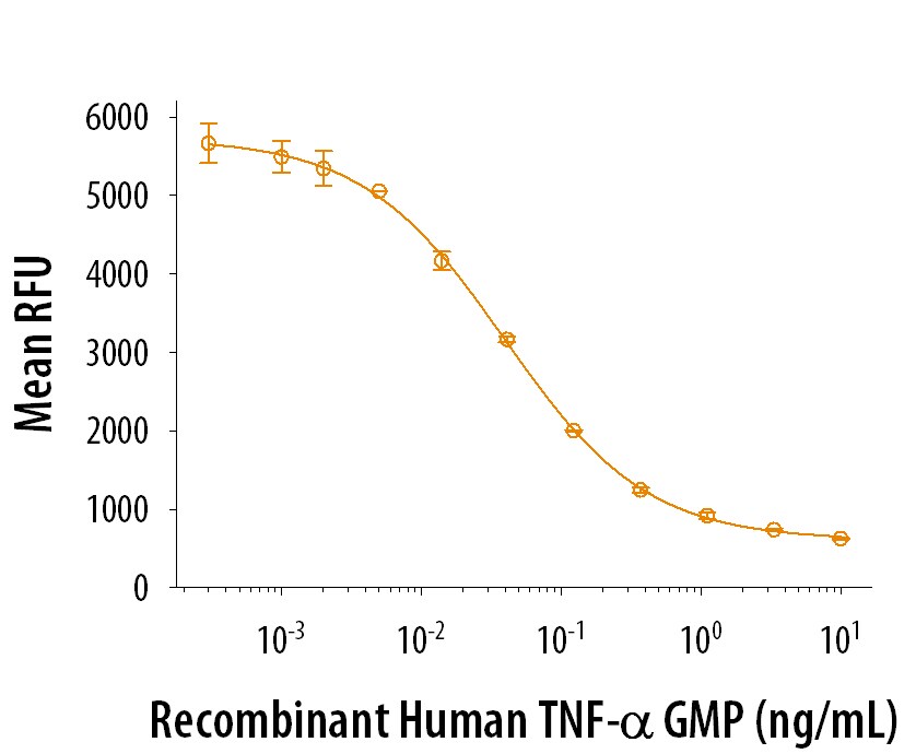 | Bio-activity : | Measured in a cytotoxicity assay using L-929 mouse fibroblast cells in the presence of the metabolic inhibitor actinomycin D. Matthews, The ED50 for this effect is 25-100 pg/mL. The specific activity of recombinant human TNF-alpha GMP is >4.3 x 107 IU/mg, which is calibrated against the human TNF-alpha WHO International Standard. |