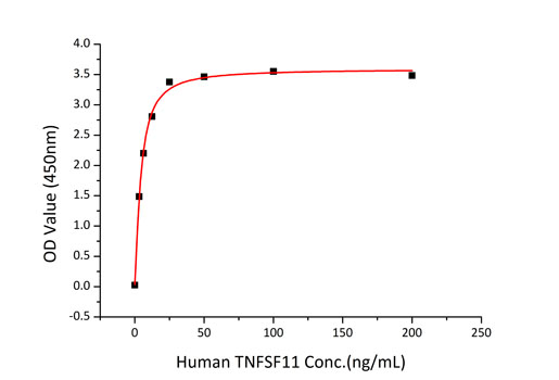 | Bio-activity : | 1.Measured by its binding ability in a functional ELISA. Immobilized Recombinant human TNFRSF11B at 2 μg/mL (100 μL/well) can bind Recombinant human TNFSF11 with a linear range of 2-8 ng/mL. 2.Measured by its ability to inhibit TRAIL-mediated cytotoxicity using L-929 mouse fibroblast cells treated with TRAIL. The ED50 for this effect is 28.5-114 pg/mL in the presence of 20 ng/mL Recombinant Human TRAIL/TNFSF10. |
