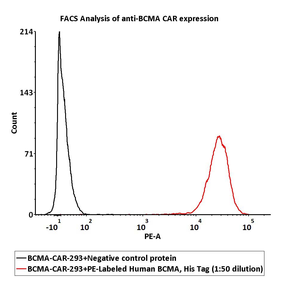 | Bio-activity : | 1e6 of the Anti-BCMA CAR-293 cells were stained with 100 μL of 1:50 dilution (2 μL stock solution in 100 μL FACS buffer) of PE-Labeled Human BCMA Protein, His Tag and negative control protein respectively, PE signal was used to evaluate the binding activity. |