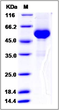 Molecular Mass : | The recombinant human TNFSF11/mFc comprises 418 amino acids and has a predicted molecular mass of 47.1 kDa. The apparent molecular mass of the monomer is approximately 50-60 kDa in SDS-PAGE under reducing conditions due to glycosylation. |