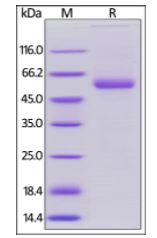 | Molecular Mass : | This protein carries a mouse IgG2a Fc tag at the C-terminus.The protein has a calculated MW of 42.3 kDa. The protein migrates as 53-60 kDa under reducing (R) condition (SDS-PAGE) due to glycosylation. |