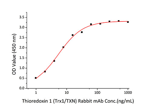| Bio-activity : | 1.Measured by its binding ability in a functional ELISA. Immobilized Human TXN Protein at 1 μg/mL (100 μL/well) can bind TXN Rabbit mAb with a linear range of 0.976-5.3 ng/mL. 2.Measured by its ability to catalyze the reduction of insulin. The reaction leads to precipitation, which can be measured by absorbance at 650 nm. The specific activity is >9 A650/min/mg. |