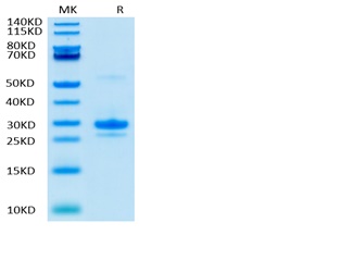 | Molecular Mass : | This protein carries a polyhistidine tag at the N-terminus, followed by an Avi tag (Avitag).The protein has a calculated MW of 22.4 kDa (monomer). As a result of glycosylation, the protein migrates as 25-33 kDa (monomer) under reducing (R) condition, and 42-55 kDa (homodimer) under non-reducing (NR) condition (SDS-PAGE). |