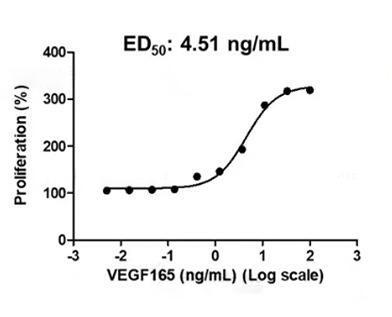 | Bio-activity : | Measure by its ability to induce HUVEC cells proliferation. The ED50 for this effect is < 5 ng/mL. The specific activity of recombinant human VEGF165 is approximately >1.4 × 10⁶ IU/mg. |