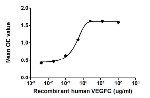 Vascular endothelial growth factor C (VEGFC) is a protein that is a member of the platelet-derived growth factor/vascular endothelial growth factor (PDGF/VEGF) family. It plays key roles in the physiology and pathology of many aspects of the cardiovascular system, including vasculogenesis, hematopoiesis, angiogenesis and vascular permeability. To test the effect of VEGFC on cell proliferation of ECV304 endothelium cell line, cells were seeded into triplicate wells of 96-well plates at a density of 2,000cells/well and allowed to attach overnight, then the medium was replaced with serum-free standard DMEM prior to the addition of various concentrations of VEGFC. After incubated for 72h, cells were observed by inverted microscope and cell proliferation was measured by Cell Counting Kit-8 (CCK-8). Briefly, 10µL of CCK-8 solution was added to each well of the plate, then measure the absorbance at 450nm using a microplate reader after incubating the plate for 1-4 hours at 37°C. The dose-effect curve of VEGFC was shown. It was obvious that VEGFC significantly promoted cell proliferation of ECV304 cells. The ED50 for this effect is typically 0.304 to 1.339µg/mL. |