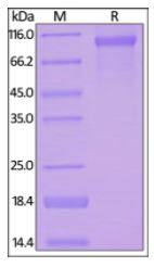| Molecular Mass : | This protein carries a polyhistidine tag at the C-terminus.The protein has a calculated MW of 84.0 kDa. The protein migrates as 90-110 kDa under reducing (R) condition (SDS-PAGE) due to different glycosylation. |