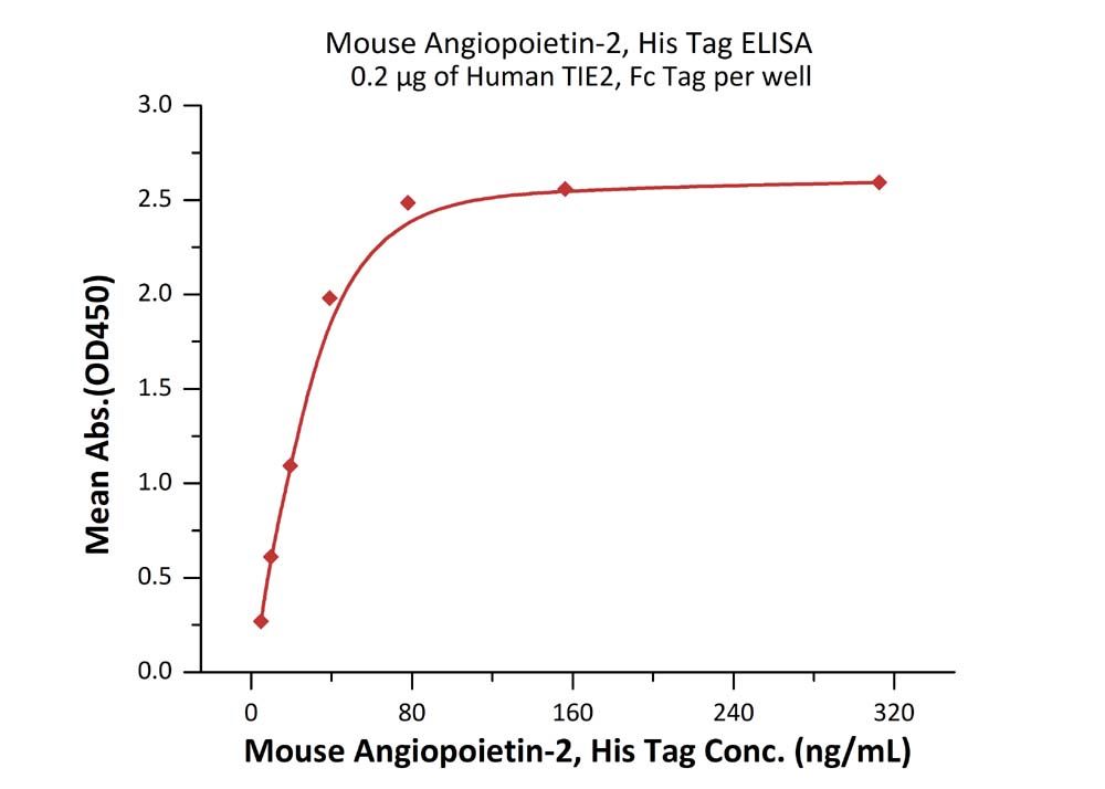 | Bio-activity : | Immobilized Human TIE2, Fc Tag at 2 μg/mL (100 μL/well) can bind Mouse Angiopoietin-2, His Tag with a linear range of 2-39 ng/mL. |