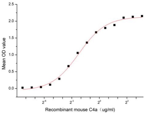 Complement Component 4a (C4a) is a component of the complement system, which is a cleavage product of the complement C4 protein. C4a has been implicated in various inflammatory and immune responses. It acts as a chemoattractant, recruiting immune cells such as neutrophils and macrophages to the site of inflammation. Additionally, C4a can stimulate the release of pro-inflammatory cytokines and chemokines, further amplifying the immune response. Besides, the binding of MASP2 to C4a is an important step in the lectin pathway of the complement system, thus a functional binding ELISA assay was conducted to detect the interaction of recombinant mouse C4a and recombinant human MASP2. Briefly, C4a was diluted serially in PBS with 0.01% BSA (pH 7.4). Duplicate samples of 100 μl were then transferred to MASP2-coated microtiter wells and incubated for 1h at 37°C. Wells were washed with PBST and incubated for 1h with anti-C4a pAb, then aspirated and washed 3 times. After incubation with HRP labelled secondary antibody for 1h at 37°C, wells were aspirated and washed 5 times. With the addition of substrate solution, wells were incubated 15-25 minutes at 37°C. Finally, add 50 µL stop solution to the wells and read at 450/630 nm immediately. The binding activity of recombinant mouse C4a and recombinant human MASP2 was shown, the EC50 for this effect is 0.21 ug/mL. |