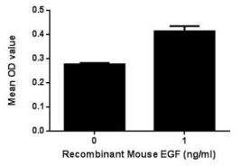 Epidermal growth factor (EGF) binding to EGFR, results in cellular proliferation, differentiation, and survival. To test the effect of EGF on cell proliferation, 3T3 fibroblasts cells were seeded into triplicate wells of 96-well plates at a density of 2,000 cells/well and allowed to attach, replaced with serum-free overnight, then the medium was replaced with 1% serum standard DMEM prior to the addition of various concentrations of recombinant mouse EGF. After incubated for 96h, cells were observed by inverted microscope and cell proliferation was measured by Cell Counting Kit-8 (CCK-8). Briefly, 10µL of CCK-8 solution was added to each well of the plate, then the absorbance at 450nm was measured using a microplate reader after incubating the plate for 1-4 hours at 37°C. Proliferation of 3T3 cells after incubation with EGF for 96h observed by inverted microscope was shown. Cell viability was assessed by CCK-8 (Cell Counting Kit-8) assay after incubation with recombinant EGF for 96h. It was obvious that EGF significantly increased cell viability of 3T3 cells. |