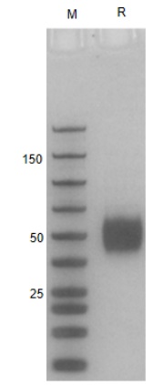 Molecular Mass : | The protein has a calculated MW of 24 kDa.The reducing (R) heterodimer protein migrates as 35-70 kDa due to glycosylation |