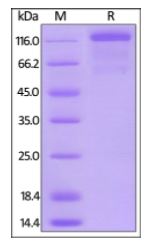 Molecular Mass : | This protein carries a mouse IgG2a Fc tag at the C-terminus.The protein has a calculated MW of 111.5 kDa. The protein migrates as 116-125 kDa under reducing (R) condition (SDS-PAGE) due to glycosylation. |
