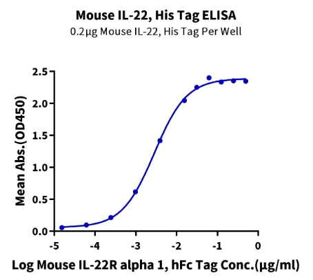 | Bio-activity : | Immobilized Mouse IL-22, His Tag at 2μg/ml (100μl/well) on the plate. Dose response curve for Mouse IL-22R alpha 1, hFc Tag with the EC50 of 2.9ng/ml determined by ELISA. |