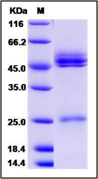The recombinant mouse IL23 (mouse IL23A&IL12B Heterodimer) comprises 510 (186+324) amino acids and has a calculated molecular mass of 58.3 (21.1+ 37.2) KDa. The apparent molecular mass of the recombinant protein is approximately 47,45 and 26 KDa respectively in SDS-PAGE under reducing conditions. |