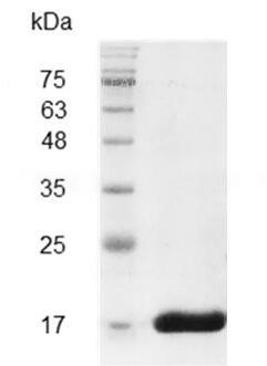 | Molecular Mass : | The protein has a calculated MW of 18.27 kDa. The protein migrates about 17 kDa under reducing condition (SDS-PAGE analysis). |