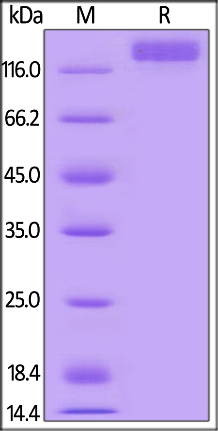 Molecular Mass : This protein carries a mouse IgG2a Fc tag at the C-terminusThe protein has a calculated MW of 110.1 kDa. The protein migrates as 120-135 kDa under reducing (R) condition (SDS-PAGE) due to glycosylation.
