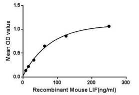 | Bio-activity : | Leukemia inhibitory factor (LIF), is an interleukin 6 class cytokine that affects cell growth by inhibiting differentiation. LIF as a cytokine also has another fuction including: the growth promotion and cell differentiation of different types of target cells, influence on bone metabolism, cachexia, neural development, embryogenesis and inflammation. Besides, Colony Stimulating Factor Receptor, Granulocyte (GCSFR) has been identified as an interactor of LIF, thus a binding ELISA assay was conducted to detect the interaction of recombinant mouse LIF and recombinant mouse GCSFR. Briefly, LIF were diluted serially in PBS, with 0.01% BSA (pH 7.4). Duplicate samples of 100μL were then transferred to GCSFR-coated microtiter wells and incubated for 2h at 37°C. Wells were washed with PBST and incubated for 1h with anti-LIF pAb, then aspirated and washed 3 times. After incubation with HRP labelled secondary antibody, wells were aspirated and washed 3 times. With the addition of substrate solution, wells were incubated 15-25 minutes at 37°C. Finally, add 50µL stop solution to the wells and read at 450nm immediately. The binding activity of LIF and GCSFR was shown, and this effect was in a dose dependent manner. |