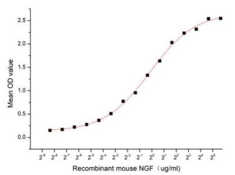Nerve Growth Factor (NGF) is the archetypal neurotrophin of a family of polypeptides .It has long occupied a critical role in developmental and adult neurobiology for its many important regulatory functions on the survival, growth and differentiation of nerve cells in the peripheral and central nervous system. The Caspase 3 (CASP3) is high affinity receptor for Nerve Growth Factor,thus a functional binding ELISA assay was conducted to detect the interaction of recombinant mouse NGF and recombinant human CASP3. Briefly, NGF was diluted serially in PBS with 0.01% BSA (pH 7.4). Duplicate samples of 100 μl were then transferred to CASP3-coated microtiter wells and incubated for 1h at 37°C. Wells were washed with PBST and incubated for 1h with anti-NGF pAb, then aspirated and washed 3 times. After incubation with HRP labelled secondary antibody for 1h at 37°C, wells were aspirated and washed 5 times. With the addition of substrate solution, wells were incubated 15-25 minutes at 37°C. Finally, add 50 µL stop solution to the wells and read at 450/630 nm immediately. The binding activity of recombinant mouse NGF and recombinant human CASP3 was shown, the EC50 for this effect is 0.86 ug/mL. |