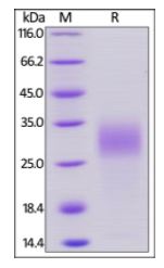 Molecular Mass : | This protein carries a polyhistidine tag at the C-terminus.The protein has a calculated MW of 17.8 kDa. The protein migrates as 27-35 kDa under reducing (R) condition (SDS-PAGE) due to glycosylation. |