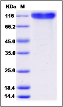 The recombinant mouse SELP comprises 679 amino acids and has a predicted molecular mass of 74 kDa. The apparent molecular mass of the protein is approximately 116 kDa in SDS-PAGE under reducing conditions. |