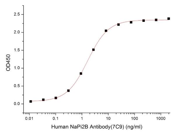 | Bio-activity : | Immobilized Recombinant Mouse NaPi2b-Flag at 2μg/ml (100 μl/well) can bind Human NaPi2b Antibody (7C9). The ED50 of Human NaPi2b Antibody (7C9) is 1.65ng/ml. |