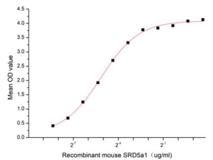 | Bio-activity : | Steroid 5 Alpha Reductase 1 (SRD5a1) a member of the steroid 5α-reductase family (SRD5A1, SRD5A2 and SRD5A3) converting testosterone into 5-alpha-dihydrotestosterone and progesterone or corticosterone into their corresponding 5-alpha-3-oxosteroids. It plays a central role in sexual differentiation and androgen physiology. SRD5A1 was mainly expressed in the skin, scalp, liver, and brain tissues. Prostatic Adenoma and Prostatic Hyperplasia are associated with SRD5A1. Besides, 17-Beta-Hydroxysteroid Dehydrogenase Type 3 (HSD17b3) has been identified as an interactor of SRD5a1, thus a functional binding ELISA assay was conducted to detect the interaction of recombinant mouse SRD5a1 and recombinant human HSD17b3. Briefly, biotin-linked SRD5a1 were diluted serially in PBS, with 0.01% BSA (pH 7.4). Duplicate samples of 100 μl were then transferred to HSD17b3-coated microtiter wells and incubated for 1h at 37°C. Wells were washed with PBST 3 times and incubation with Streptavidin-HRP for 30min, then wells were aspirated and washed 5 times. With the addition of substrate solution, wells were incubated 15-25 minutes at 37°C. Finally, add 50 µl stop solution to the wells and read at 450 nm immediately. The binding activity of recombinant mouse SRD5a1 and recombinant human HSD17b3 was shown, the EC50 for this effect is 0.03 ug/mL. |