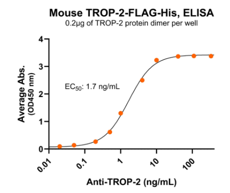 | Description : | TROP-2 (trophoblast cell surface antigen 2) is a cell-surface type I transmembrane glycoprotein expressed in epithelial cells of various tissues. TROP-2 is also known as TROP2, TACSTD2, EGP-1, pancreatic carcinoma marker protein GA733–1/GA733, gastrointestinal tumor-associated antigen GA7331, GP50, M1S1, tumor-associated calcium signal transducer 2, CAA1, and TTD2. TROP-2 exists as a monomer on the cell surface but can form dimers or oligomers on cancer cells, enhancing its role in cancer progression. TROP-2 contains an extracellular domain, a single transmembrane helix, and a cytoplasmic tail. The extracellular domain is comprised of three subdomains: a cysteine-rich domain, a thyroglobulin type-1 domain, and a cysteine-poor domain. TROP-2 is normally involved in the maintenance of epithelial tissue integrity. It is overexpressed in many human cancers including breast cancer, non-small-cell lung cancer, thyroid cancer, gastric cancer, pancreatic cancer, and ovarian cancer. TROP-2 overexpression is involved in cancer cell growth, proliferation, invasion, migration, and survival of cancer cells, and is associated with tumor aggressiveness and poor prognosis. TROP-2 is an emerging target of cancer therapeutics. Mouse TROP-2 shares 80–85% amino acid identity with human TROP-2. The functional domains are highly conserved, suggesting similar biological roles. |