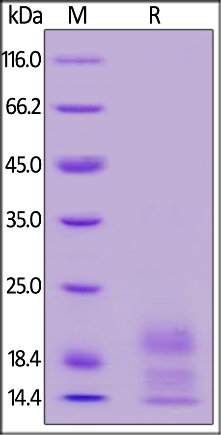 Molecular Mass : This protein carries a polyhistidine tag at the C-terminus.The protein has a calculated MW of 7.5 kDa. The protein migrates as 13 kDa and 14 kDa under reducing (R) condition (SDS-PAGE) due to glycosylation.