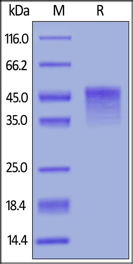 | Product Overview : | Recombinant Mouse TNFRSF4 Protein, His & Avi-tagged, Biotinylated is expressed from human 293 cells (HEK293). It contains AA Val 20 - Pro 211 (Accession # P47741-1). Predicted N-terminus: Val 20. This protein carries a polyhistidine tag at the C-terminus, followed by an Avi tag. The protein has a calculated MW of 25.0 kDa. The protein migrates as 35-50 kDa under reducing (R) condition (SDS-PAGE) due to glycosylation. The biotin to protein ratio is 0.5-1 as determined by the HABA assay. |