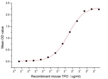 | Bio-activity : | Thrombopoietin (TPO) is a humoral growth factor that is necessary for megakaryocyte proliferation and maturation, as well as for thrombopoiesis.TPO can promote platelet production, aggregation, ECM adhesion, and activation. It is principally produced in the liver and is bound and internalized by the receptor Tpo R/c-mpl. This protein is the ligand for MLP/C_MPL, the product of myeloproliferative leukemia virus oncogene. Mutations in this gene are the cause of thrombocythemia 1. Besides, GCSF has been identified as an interactor of TPO, thus a functional binding ELISA assay was conducted to detect the interaction of recombinant mouse TPO and recombinant mouse GCSF. Briefly, biotin-linked TPO were diluted serially in PBS, with 0.01% BSA (pH 7.4). Duplicate samples of 100 μl were then transferred to GCSF-coated microtiter wells and incubated for 1h at 37°C. Wells were washed with PBST 3 times and incubation with Streptavidin-HRP for 30 min, then wells were aspirated and washed 5 times. With the addition of substrate solution, wells were incubated 15-25 minutes at 37°C. Finally, add 50 µl stop solution to the wells and read at 450 nm immediately. The binding activity of TPO and GCSF was shown, the EC50 for this effect is 0.68 ug/mL. |