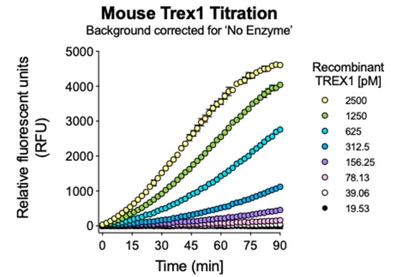 TREX1 exonuclease activity liberates free fluorophore from DNA containing a 5'-fluorophore and a 3'-quencher to generate a fluorescent signal. Compound-mediated inhibition of TREX1 activity would be anticipated to reduce fluorescent signal. All reactions were conducted in 20 uL total volumes in 384-well F-bottom polystyrene microplates at 25 °C. Assay buffer consisted of: 25 mM HEPES (pH 7.5), 20 mM KCl, 1 mM DTT, 0.1 mg/mL BSA, 0.01% Triton X-100, 0.25 mM EDTA and 10 mM MgCl2. Reactions were initiated upon the addition dsDNA (oligo 1: /5TEX615/GCTAGGCAG and oligo 2: CTGCCTAGC/3IAbRQSp/ stocks in DNA duplex buffer at a final concentration of 230nM. Fluorescence was measured every two minutes for 60 minutes at 615 nm emission and 570 nm excitation at 25 °C using a NEO plate reader. |