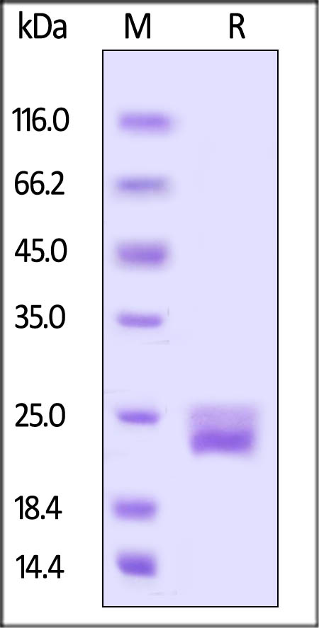 Product Overview : | Recombinant Mouse VEGF120 Protein, His & Avi-tagged, Biotinylated is expressed from human 293 cells (HEK293). It contains AA Ala 27 - Arg 146 (Accession # Q00731-3). Predicted N-terminus: His. This protein carries a polyhistidine tag at the N-terminus, followed by an Avi tag. The protein has a calculated MW of 17.3 kDa. The protein migrates as 22-24 kDa and 24-26 kDa under reducing (R) condition (SDS-PAGE) due to glycosylation. The biotin to protein ratio is 0.5-1 as determined by the HABA assay. |