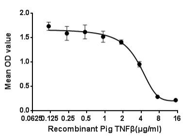 TNF-β, a member of the tumor necrosis factor family, is a potent lymphoid factor that exerts cytotoxic effects on a wide range of tumor cells . The biological effects of TNF-β are very similar to TNF-α,due to the similarity of molecular structure and the receptors.As reported, TNF-α could inhibit the proliferation and induce apoptosis of A549 cells,therefore, A549 cells were seeded into triplicate wells of 96-well plates at a density of 4,000 cells/well with 5% serum standard DMEM including various concentrations of recombinant pig TNF-β. After incubated for 48h, cells were observed by inverted microscope and cell proliferation was measured by Cell Counting Kit-8 (CCK-8). Briefly, 10 µL of CCK-8 solution was added to each well of the plate, then the absorbance at 450 nm was measured using a microplate reader after incubating the plate for 2 hours at 37°C. Proliferation of A549 cells after incubation with TNF-β for 48h observed by inverted microscope was shown. Cell viability was assessed by CCK-8 (Cell Counting Kit-8 ) assay after incubation with recombinant pig TNF-β for 48h. It was obvious that TNF-β significantly inhibit cell viability of A549 cells. The ED50 is 3.5μg/ml. |