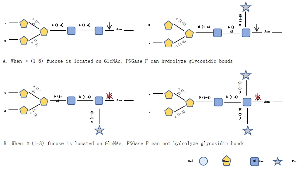 It can selectively hydrolyze all N-glycan chains linked to Asn in proteins, except those containing α1-3 fucosidic bonds. The cleavage site is the glycosidic bond between Asn and the innermost GlcNAc. This causes the glycoprotein to release the Asn-linked sugar molecules and converts Asn to Asp. The cleaved glycan types include high-mannose, hybrid, and complex oligosaccharides. |