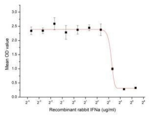 Interferon-alpha (IFNa), also known as leukocyte interferon, represents a group of related but distinct proteins that share over 95% amino acid sequence homology. They are members of the type I interferon family which share a common cell surface receptor composed of two subunits. IFN-α has both anti-viral and immunomodulatory activities on target cells. To test the effect of IFNa on cell apoptosis, A549 cells were seeded into triplicate wells of 96-well plates at a density of 4,000 cells/well and allowed to attach overnight, then the medium was replaced with various concentrations of recombinant rabbit IFNa diluted with 5% serum standard DMEM. After incubated for 72h, cells were observed by inverted microscope and cell proliferation was measured by Cell Counting Kit-8 (CCK-8). Briefly, 10 µl of CCK-8 solution was added to each well of the plate, then the absorbance at 450 nm was measured using a microplate reader after incubating the plate for 1-4 hours at 37°C. Apoptosis of A549 cells after incubation with IFNa for 72h observed by inverted microscope was shown. Cell viability was assessed by CCK-8 (Cell Counting Kit-8 ) assay after incubation with recombinant rabbit IFNa for 72h. It was obvious that IFNa significantly decreased cell viability of A549 cells. The ED50 of recombinant rabbit IFNa is 9.37 ug/ml. |
