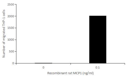 Monocyte Chemotactic Protein 1 (MCP1), also known as C-C motif chemokine 2(CCL2), is a member of the β (C-C) subfamily of chemokines that is a chemoattractant for monocytes and basophils. Rat CCL2 is secreted as a 14 kDa glycoprotein monomer but noncovalent dimers probably occur. CCL2 is best known as a chemotactic agent for mononuclear cells. Thus, chemotaxis assay used 24-well microchemotaxis system was undertaken to detect the chemotactic effect of recombinant rat MCP1 on the THP-1 cell line. Briefly, THP-1 cells were seeded into the upper chambers (150 μL cell suspension, 10^6 cells/mL in RPMI 1640 with FBS free) and MCP1 (0.01 ng/mL, 0.1 ng/mL, 1 ng/mL, 10 ng/mL,100 ng/mL and 1000 ng/mL diluted separately in serum free RPMI 1640 ) was added in lower chamber with a polycarbonate filter (8 μm pore size) used to separate the two compartments. After incubation at 37°C with 5% CO2 for 2h, the filter was removed, then cells in low chamber were observed by inverted microscope at low magnification (×100) and the number of migrated cells were counted at high magnification (×400) randomly (five fields for each filter). Result shows MCP1 is able to induce migration of THP-1 cells. The migrated THP-1 cells in low chamber at low magnification (×100) were shown. Five fields of each chamber were randomly chosen, and the migrated cells were counted at high magnification (×400). The optimum chemotaxis of recombinant rat MCP1 occurs at 0.01-0.1 ng/mL. |