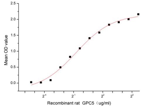 Glypican 5 (GPC5) belongs to the glypican family of proteoglycans that are linked to the cell surface through a glycosyl-phosphatidylinositol anchor. GPC5 is expressed primarily in embryonic neurons and mesenchyme and it is implicated in a variety of physiological processes, ranging from cell proliferation to morphogenesis. Besides, Syndecan 1 (SDC1) has been identified as an interactor of GPC5, thus a functional binding ELISA assay was conducted to detect the interaction of recombinant rat GPC5 and recombinant human SDC1. Briefly, GPC5 was diluted serially in PBS with 0.01% BSA (pH 7.4). Duplicate samples of 100 μl were then transferred to SDC1-coated microtiter wells and incubated for 1h at 37°C. Wells were washed with PBST and incubated for 1h with anti-GPC5 pAb, then aspirated and washed 3 times. After incubation with HRP labelled secondary antibody for 1h at 37°C, wells were aspirated and washed 5 times. With the addition of substrate solution, wells were incubated 15-25 minutes at 37°C. Finally, add 50 µL stop solution to the wells and read at 450/630 nm immediately. The binding activity of recombinant rat GPC5 and recombinant human SDC1 was shown, the EC50 for this effect is 0.6 ug/mL. |
