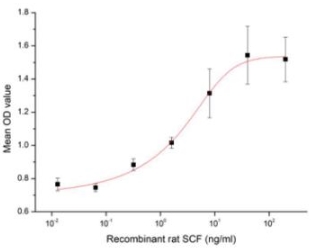 Stem cell factor (SCF), also known as mast cell growth factor (MGF), and steel factor (SLF), plays an important role in hematopoiesis, spermatogenesis and melanogenesis. SCF has been shown to stimulate the proliferation of TF-1 cells. To test this effect, TF-1 cells were seeded into triplicate wells of 96-well plates at a density of 2 x 10^4 cells/well and incubated for 72h in the presence or absence of various concentrations of SCF at 37°C. The growth of cells were observed by inverted microscope and cell proliferation was measured by Cell Counting Kit-8(CCK-8). Briefly, 10 µl of CCK-8 solution was added to each well of the plate, then measure the absorbance at 450 nm using a microplate reader after incubating the plate for 1-4 hours at 37°C. Cell proliferation of TF-1 cells after incubation with SCF for 72h observed by inverted microscope was shown. The dose-effect curve of SCF was shown. It was obvious that it significantly promoted cell proliferation of TF-1 cells .The ED50 for this effect is typically 2.9 ng/ml. |