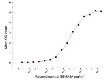 | Bio-activity : | The Semaphorin 3A(SEMA3A) which belongs to the semaphorin family can function as either a chemorepulsive agent, inhibiting axonal outgrowth, or as a chemoattractive agent, stimulating the growth of apical dendrites. In both cases, the protein is vital for normal neuronal pattern development. Semaphorin 3A is secreted protein containing a Sema domain, an immunoglobulin C2-like domain and a basic domain near the carboxyl tail. It can be secreted by neurons and surrounding tissue to guide migrating cells and axons in the developing nervous system. Besides, Neuropilin 1 (NRP1) has been identified as an interactor of SEMA3A, thus a functional binding ELISA assay was conducted to detect the interaction of recombinant rat SEMA3A and recombinant human NRP1. Briefly, SEMA3A were diluted serially in PBS, with 0.01% BSA (pH 7.4). Duplicate samples of 100 ul were then transferred to NRP1-coated microtiter wells and incubated for 2h at 37°C. Wells were washed with PBST and incubated for 1h with anti-SEMA3A pAb, then aspirated and washed 3 times. After incubation with HRP labelled secondary antibody, wells were aspirated and washed 3 times. With the addition of substrate solution , wells were incubated 15-25 minutes at 37°C. Finally, add 50 ul stop solution to the wells and read at 450 nm immediately. The binding activity of recombinant rat SEMA3A and recombinant human NRP1 was shown, the EC50 for this effect is 1.22 ug/mL. |