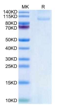 | Molecular Mass : | The protein has a predicted MW of 85.60 kDa. Due to glycosylation, the protein migrates to 90-110 kDa based on Bis-Tris PAGE result. |